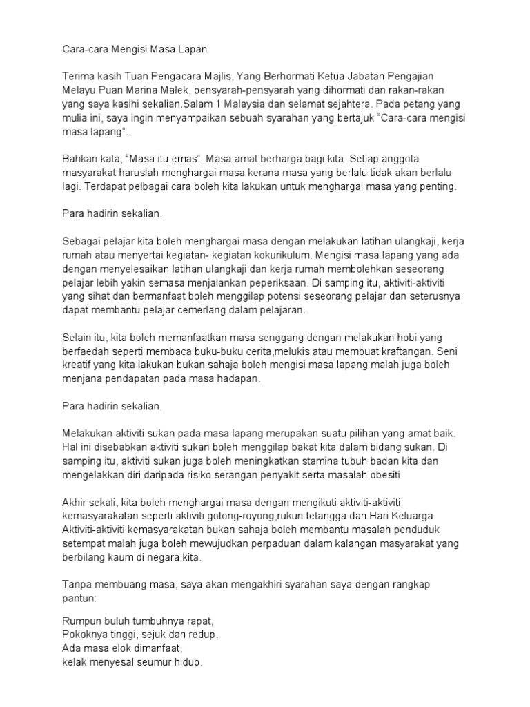 Senarai 3 Contoh Karangan Perbahasan Pt3 Yang Terbaik. Jadi tiada sebab untuk kita lari. Masa lapang yang ada wajar diisi secara bijaksana.